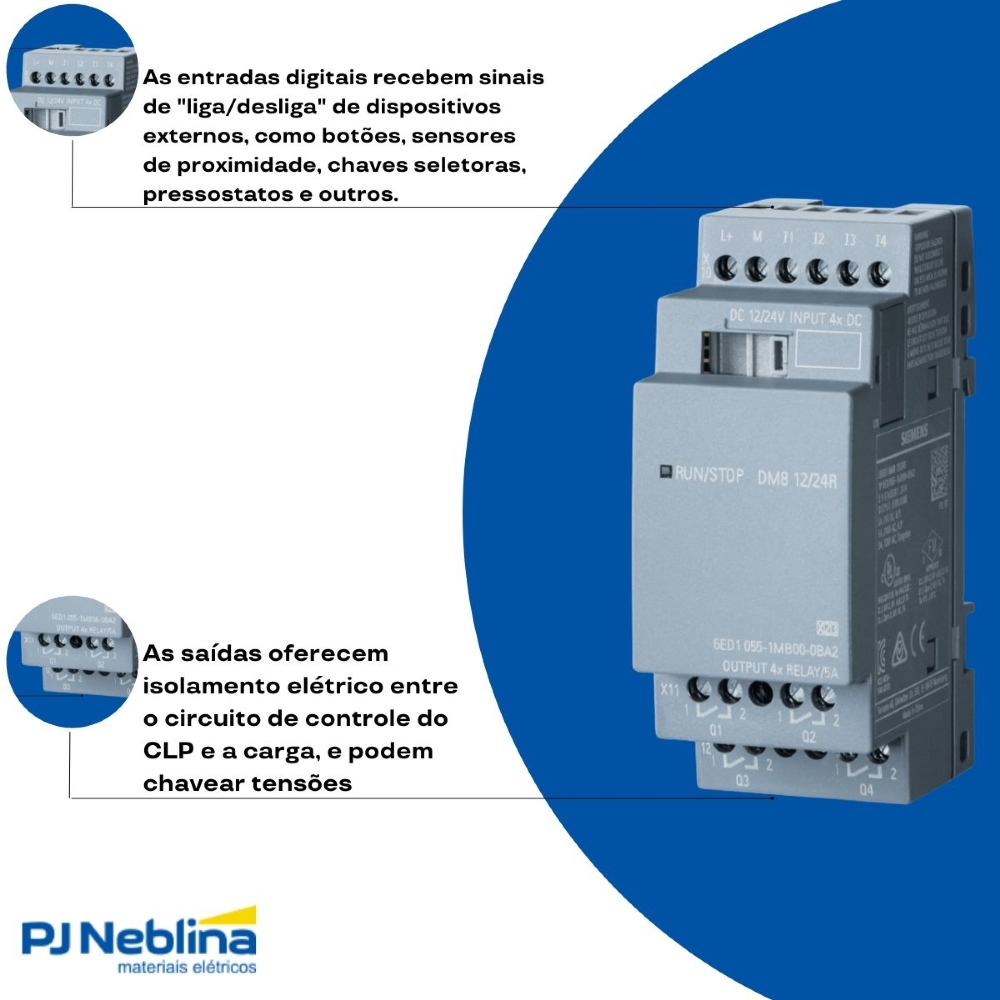- Número Total de Pontos (DM8): A designação "DM8" geralmente indica que é um Módulo Digital com um total de 8 pontos de entrada/saída (neste caso, 4 entradas + 4 saídas = 8 pontos.
