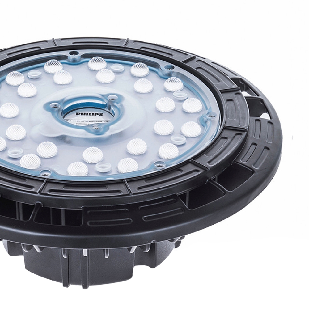 Luminária Industrial Highbay Led Preto Alumínio 85W Bivolt 50/60Hz 6500K Luz Branca 11000Lm Facho Aberto Com Gancho Fixação Philips