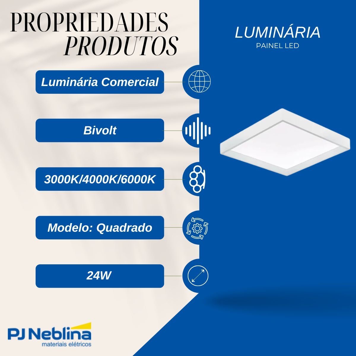 Luminaria Comercial | Tipo: Painel Led | Instalacao: Sobrepor | Modelo: Quad | Material Corpo: Aluminio | Cor Corpo: Bc | Potencia (w): 24w | Tensao (v): Bivolt | Temperatura Cor(k): 3000k/4000k/6000k | Fluxo Luminoso(lm): 1900lm | Marca: Gaya | Referencia: 7674
