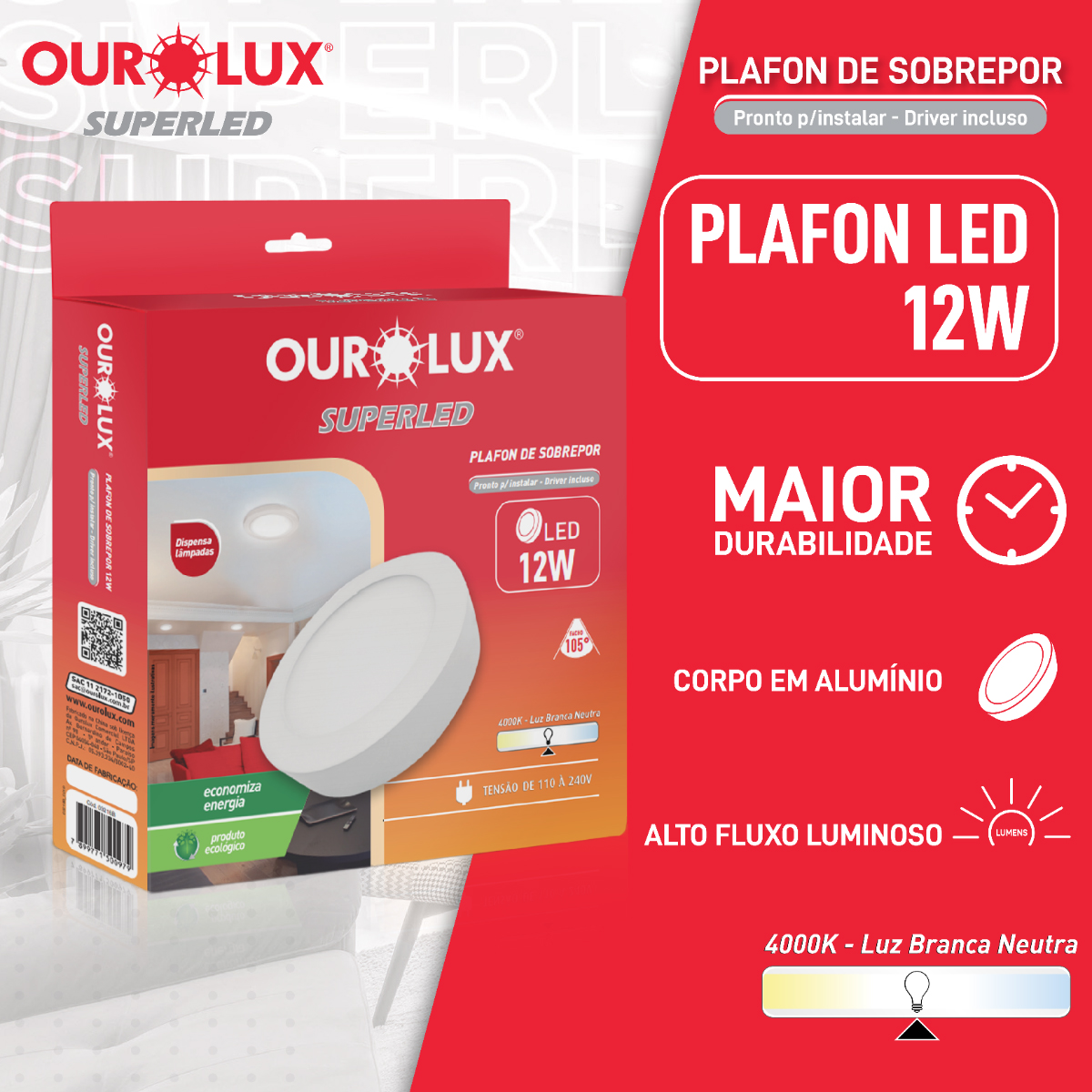 Empresa com mais de 25 anos de existência, especializada em iluminação, sendo referência e uma entre os líderes no cenário do Brasil, a Ourolux possui uma grande diversidade de produtos, com design moderno, possuindo alta qualidade e garantindo segurança. A Ourolux oferece o maior alto nível de comprometimento e qualidade com a Luminária Plafon Led Sobrepor Redondo Branco 12W Bivolt 50/60Hz 105G 15000H Ip20 4000K Luz Do Dia 720Lm 170x34x2Mm Superled, garantindo a satisfação do nosso cliente.