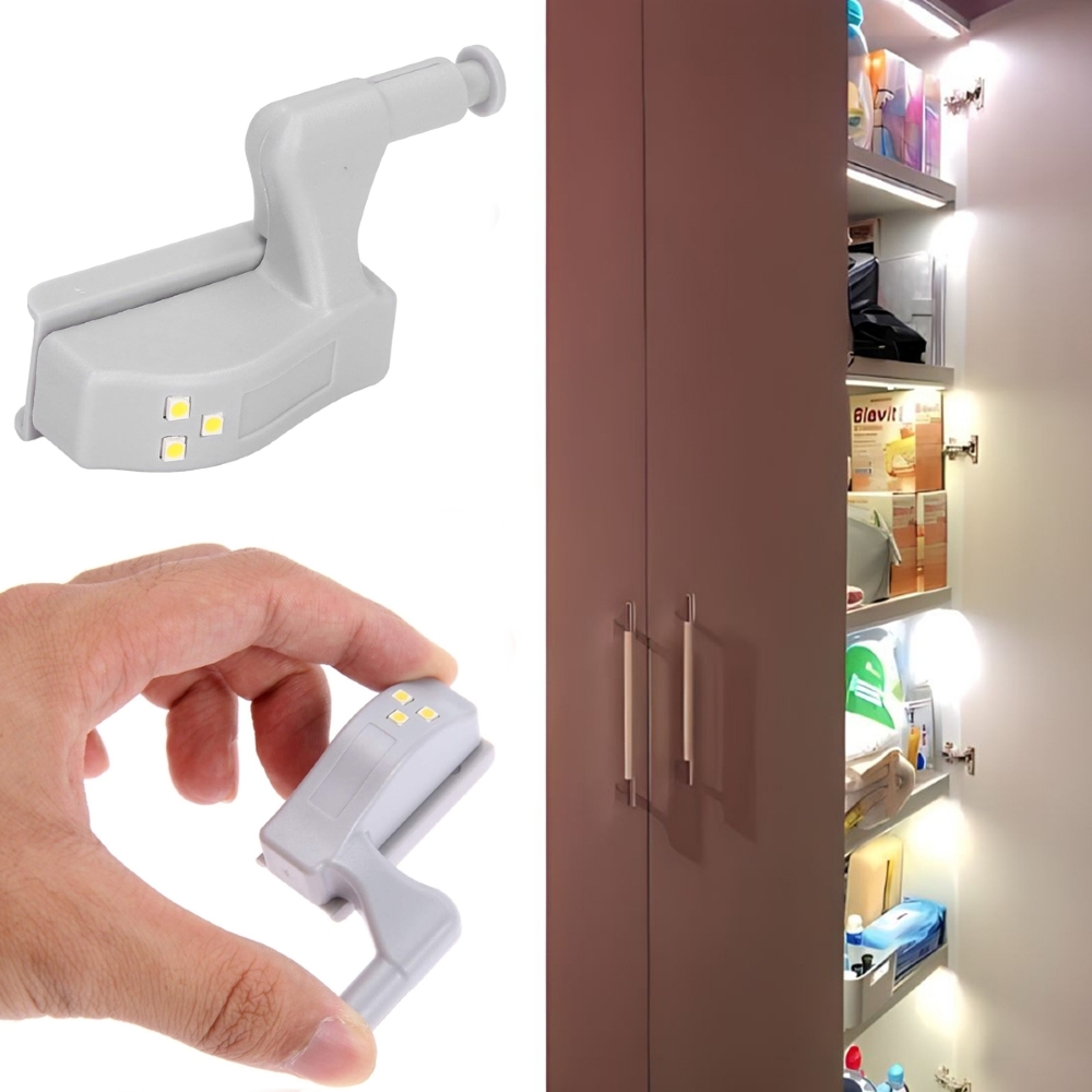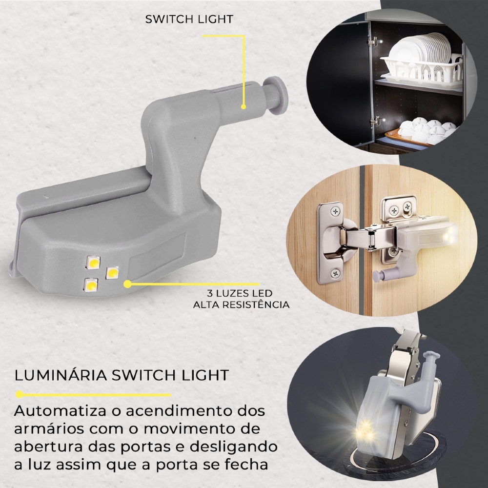 Luminária SWITCH LIGHT automatiza o acendimento dos armários com o movimento de abertura das portas e desligando a luminário assim que a porta se fecha poupando o consumo de energia da luminária.