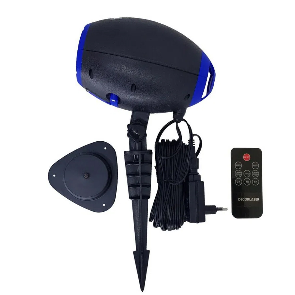 Para melhor aproveitamento, o projetor Decorlaser é adaptável a ambientes externos e internos, graças ao espeto e á base.