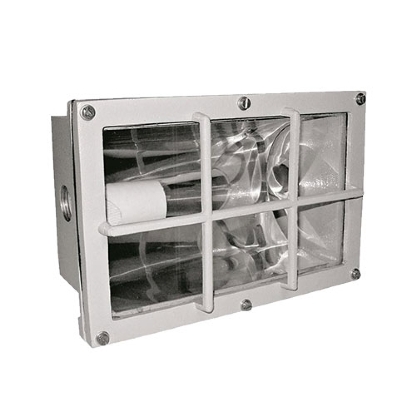 Luminária de embutir, corpo e grade de proteção em liga de alumínio fundido.