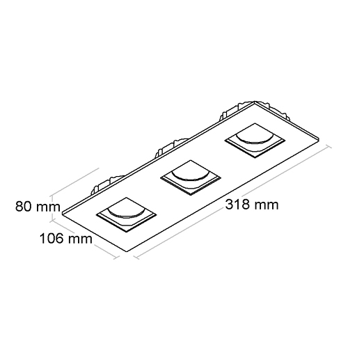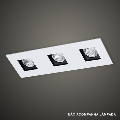 Luminária retangular de embutir com foco triplo recuado direcional. Corpo em alumínio injetado tratado com acabamento em pintura eletrostática poliéster, resistente ao intemperismo e ao amarelamento.