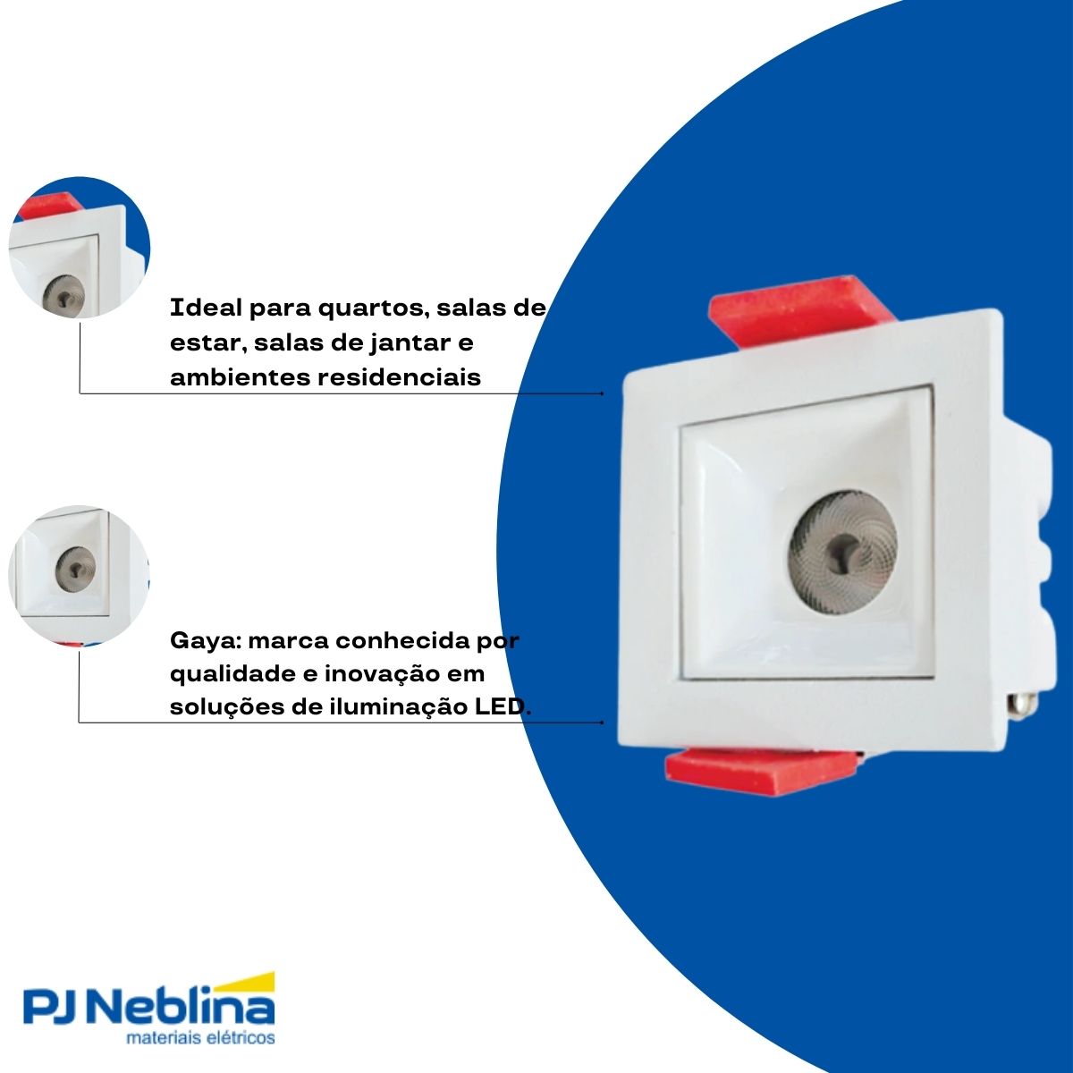 Luminaria Comercial | Tipo: Spot Led | Instalacao: Embutir | Modelo: Focco | Material Corpo: Aluminio | Cor Corpo: Bc | Potencia (w): 3w | Tensao (v): Bivolt | Temperatura Cor(k): 2700k | Cor Temperatura: Branco Quente | Fluxo Luminoso(lm): 240lm | Dimensoes: 45x45mm | Marca: Gaya | Referencia: 7576