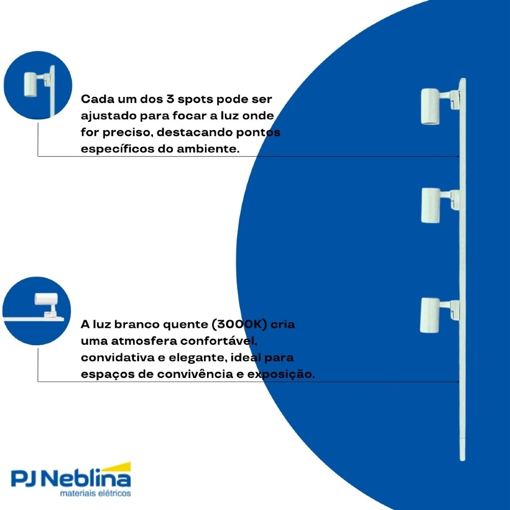 - Potência total de 30W (3 spots de 10W cada), para iluminação eficaz.