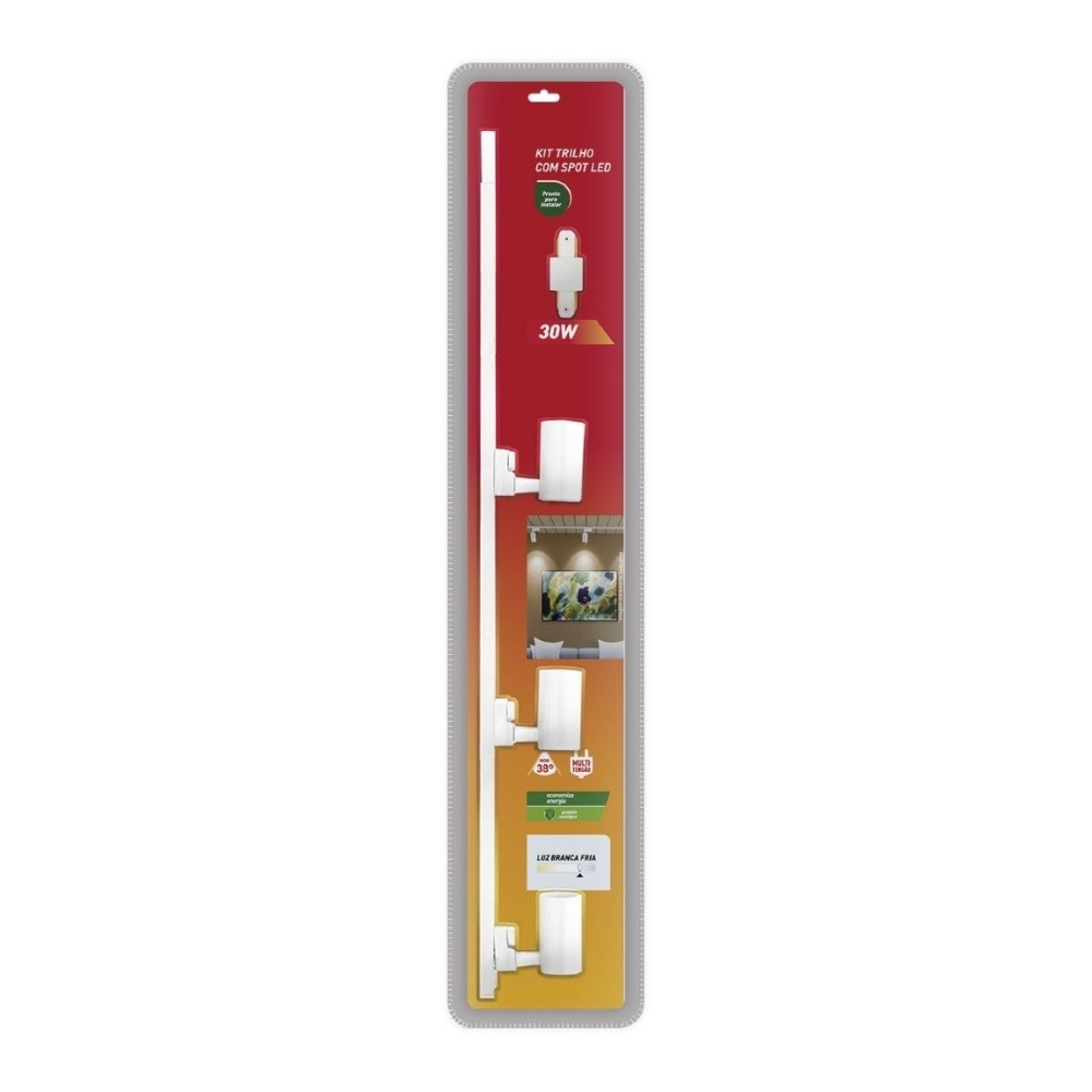 - Kit completo com trilho de 1 metro e 3 spots LED na cor branca.
