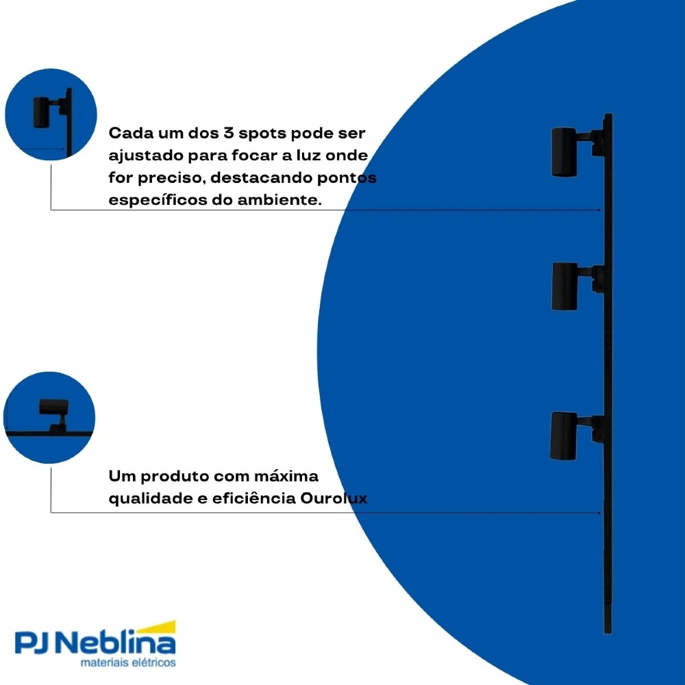 - Potência total de 30W (3 spots de 10W cada), para iluminação eficaz.