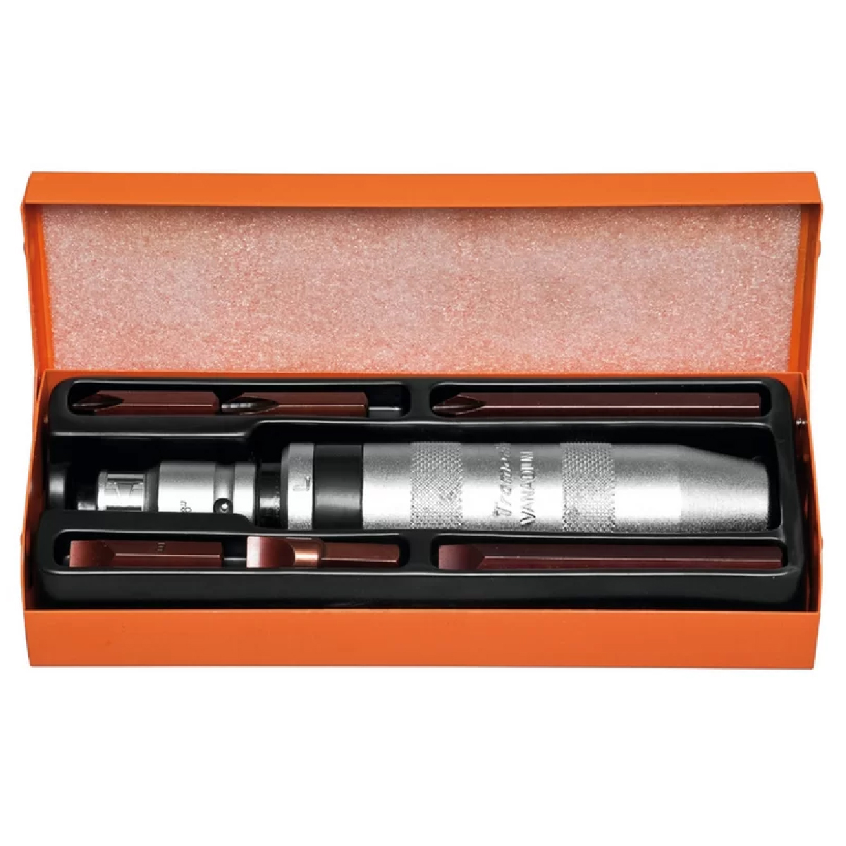 Martelete de impacto; adaptador para ponteiras; 3 pontas chatas em aço ferramenta S2: 6,5x38, 8x38, 8x76; 3 pontas cruzadas em aço ferramenta S2: PH2x38, PH3x38, PH3x76; caixa metálica.