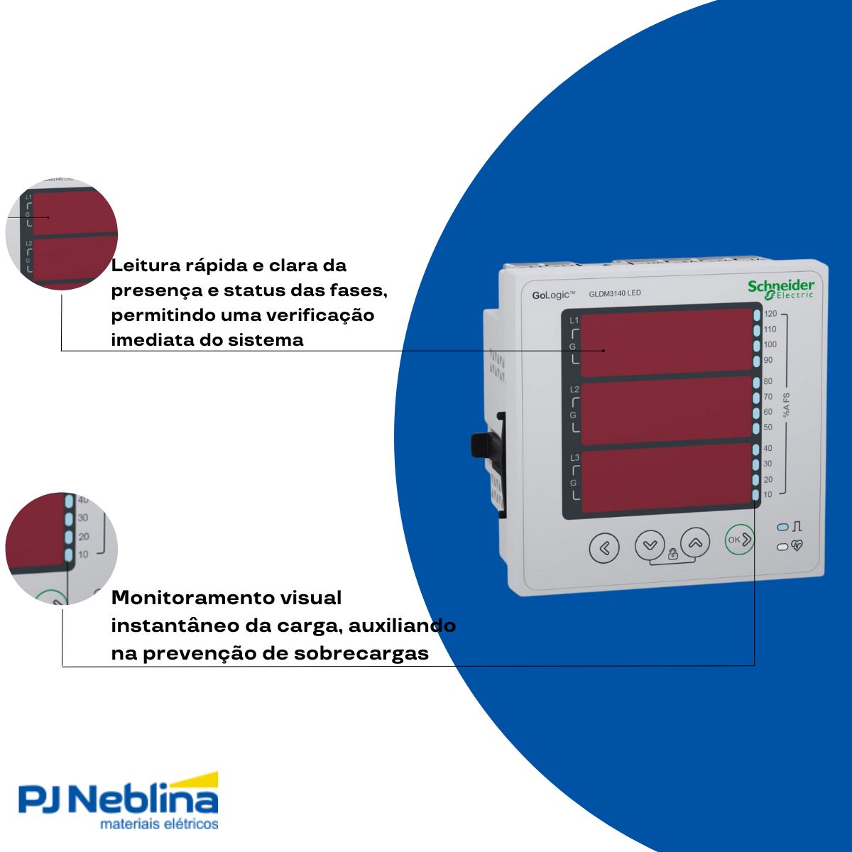 – Medição multifuncional precisa de grandezas elétricas: tensão, corrente, frequência, fator de potência, potências (ativa, reativa, aparente) e energias (ativa, reativa).