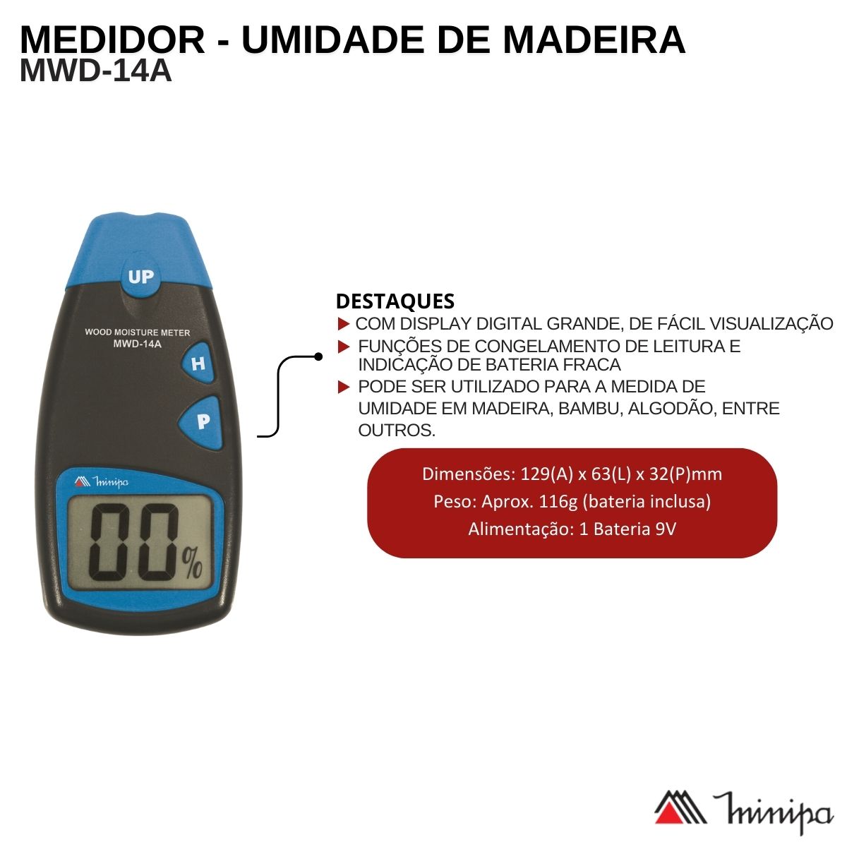 Com mais de 41 anos de existência, oferecendo qualidade e tradição, a Minipa é referência e líder no mercado nacional de instrumentos de medição. Contando com uma linha de mais de 200 produtos, que são aplicados nos segmentos industrial, comercial e educacional, que obrigatoriamente passam por um controle de qualidade rigoroso. Tendo o Medidor Umidade De Madeira Mwd-14A, você alcança o maior nível de satisfação e resolução que só a Minipa oferece.
