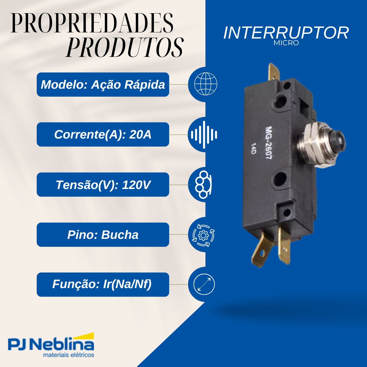 Micro interruptor Pino + Bucha 20A Ação Rápida 120V - Margirius - Código Fabricante: MG-2607 IR/E3