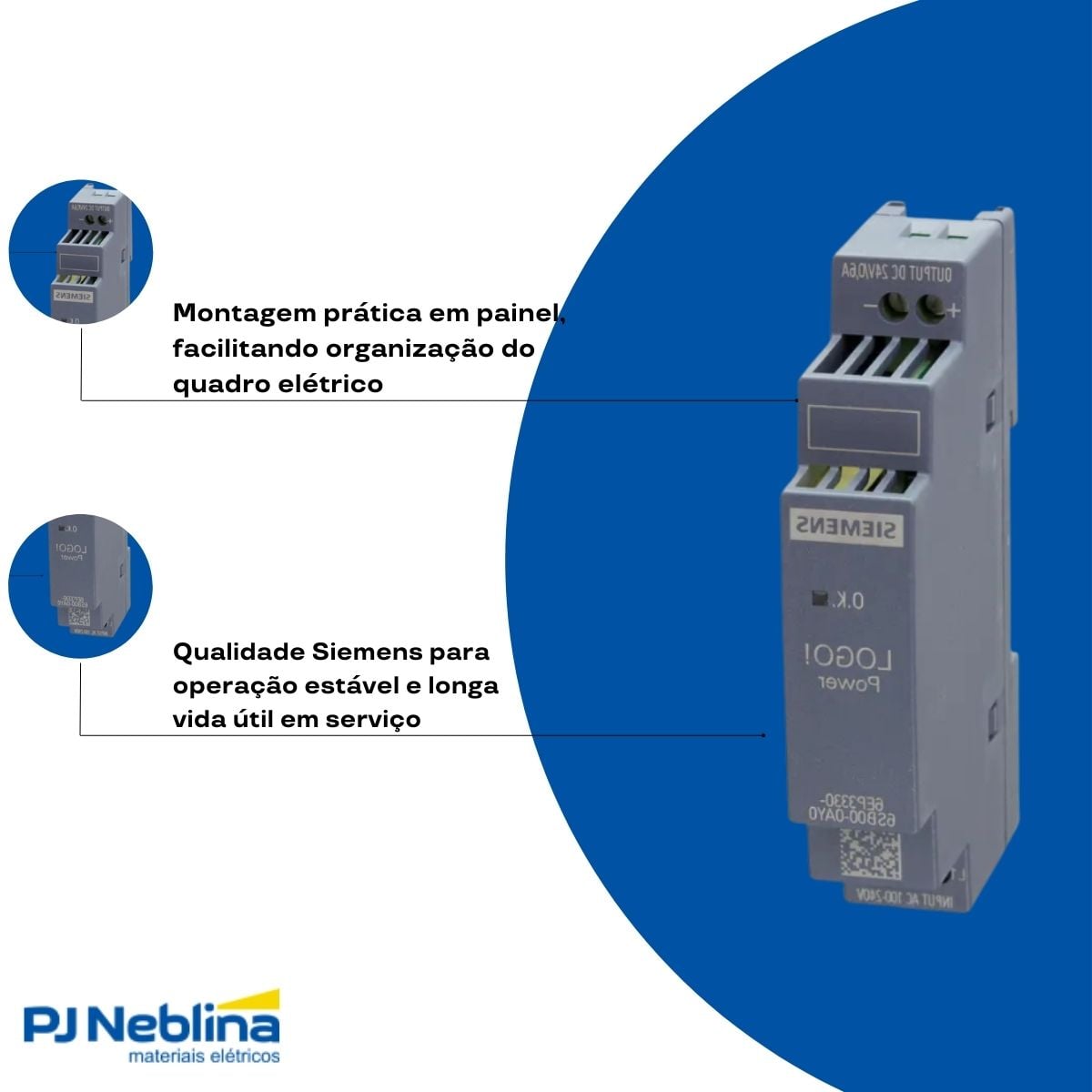 - Alimentação de CLP Siemens LOGO! e módulos auxiliares (quando compatível).