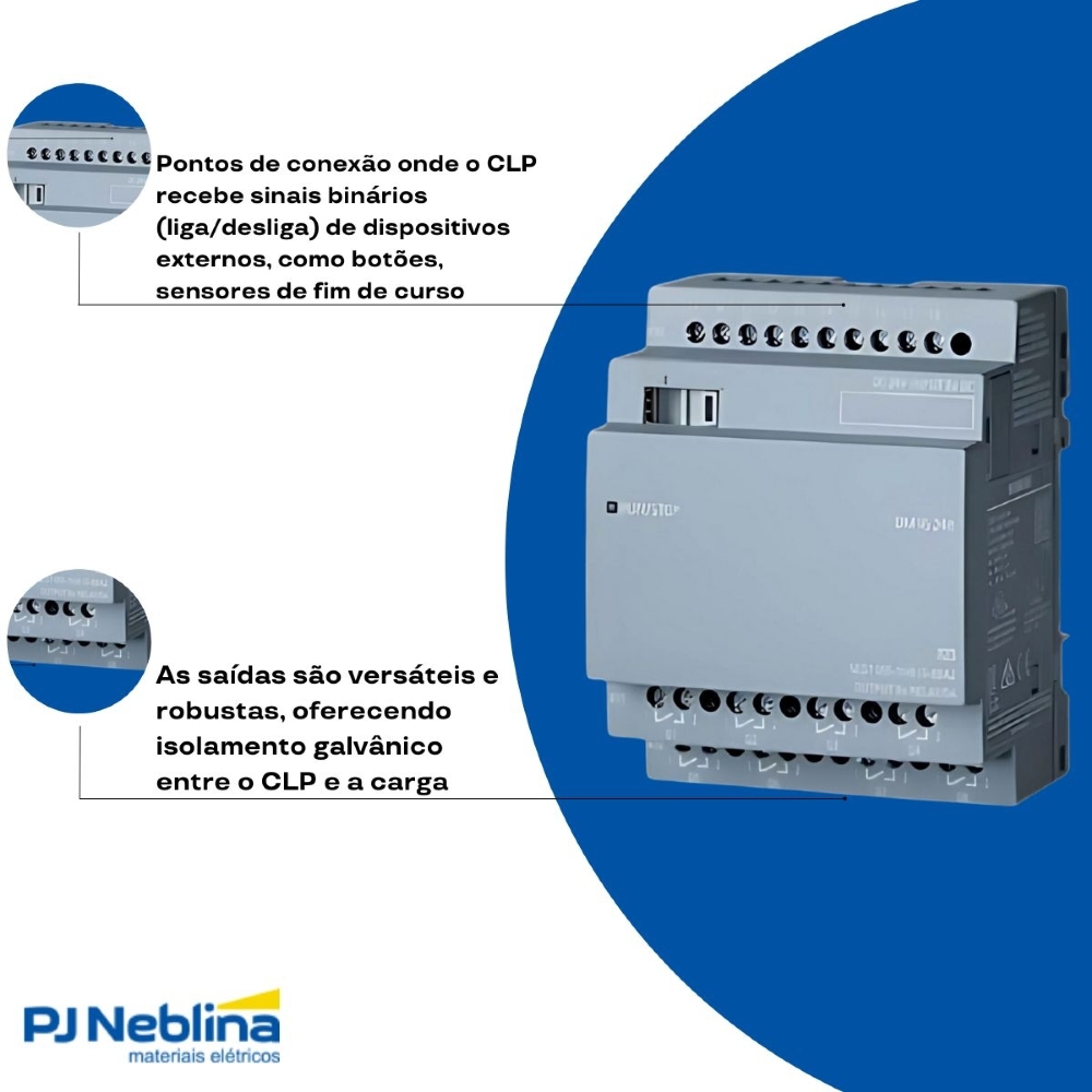 - Compatibilidade de Tensão (24R): 24V (para Entradas): As entradas digitais operam com sinais de 24 Volts de corrente contínua (CC), que é a tensão padrão e mais segura.