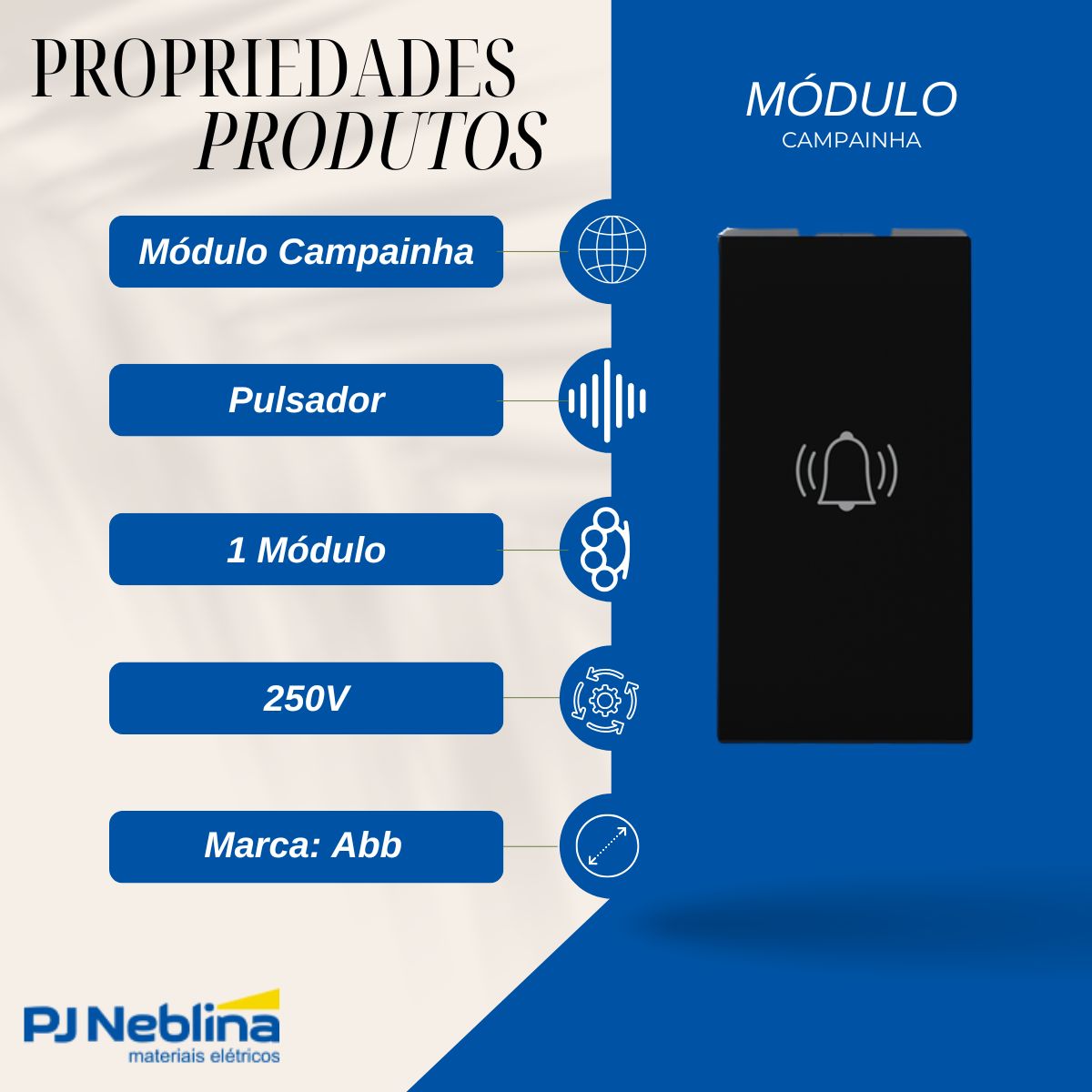 Modulo Pulsador | Modelo: Campainha | Modulos: 1 Mod | Corrente(a): 10a | Tensao (v): 250v | Cor: Pt | Linha: Origen | Marca: Abb | Referencia: N0104 Ng | Linha Fabr.: Origen