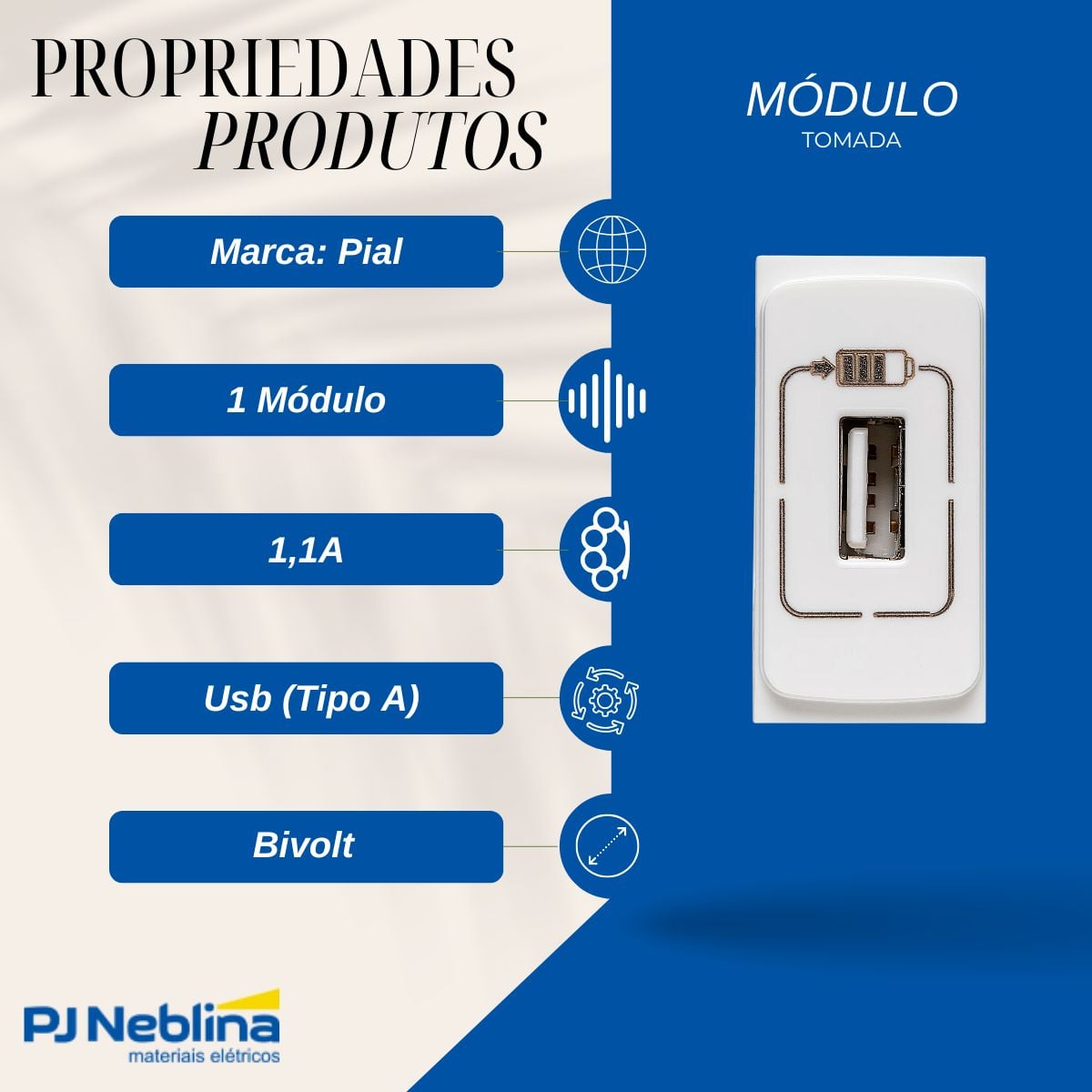 Modulo Tomada | Tipo: Carregador | Modelo: 1 Entrada Usb (tipo A) | Modulos: 1 Mod | Corrente(a): 1,1a | Tensao (v): Bivolt | Cor: Bc | Linha: Zeffia | Marca: Pial | Referencia: 680163 | Linha Fabr.: Zeffia