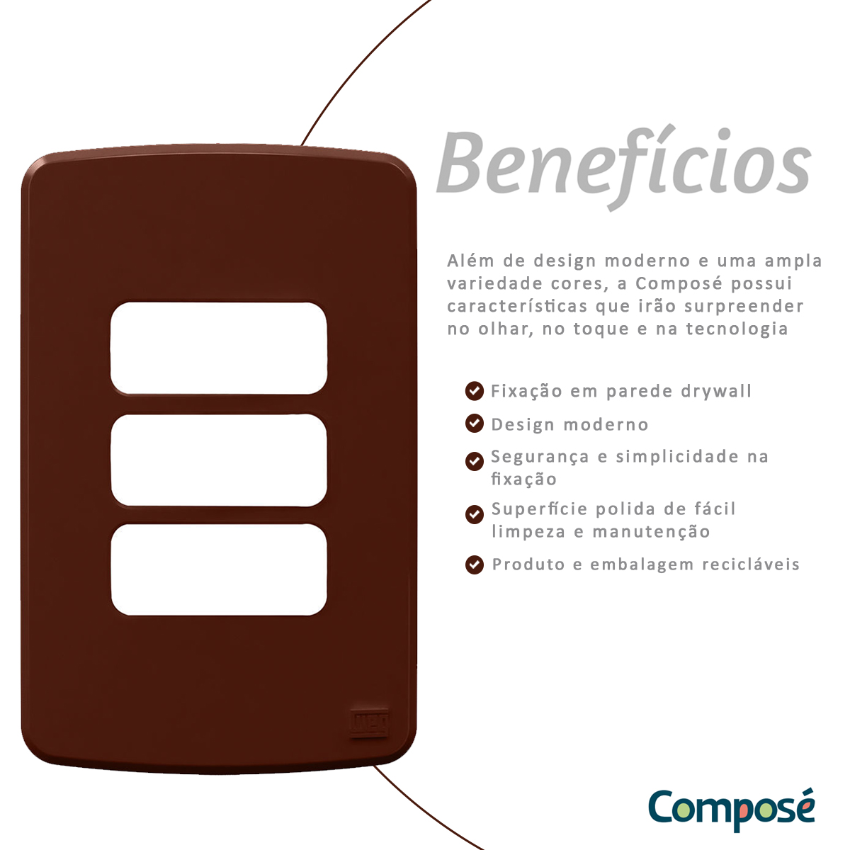Com design contemporâneo e linhas que combinam com o seu estilo, a Composé é a nova linha de Tomadas & Interruptores da WEG. Com a finalidade de deixar a sua casa do seu jeito, sem deixar de lado a funcionalidade e a qualidade já reconhecidas da marca WEG.