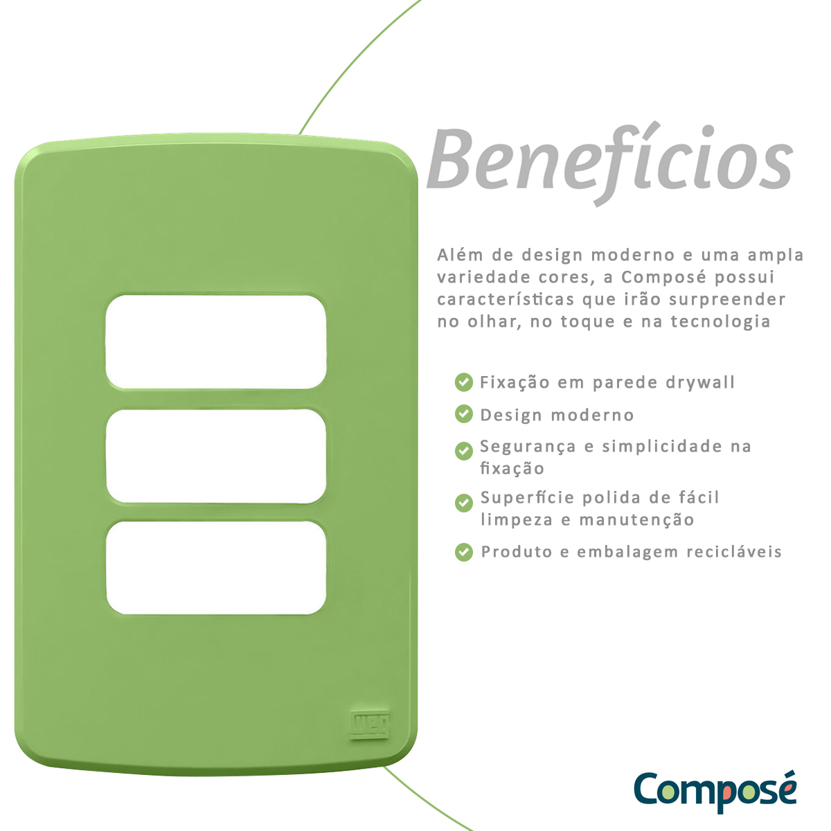 Além de design moderno e uma ampla variedade de cores, a linha de Tomadas & Interruptores Composé possui características que irão surpreender no olhar, no toque e na tecnologia.