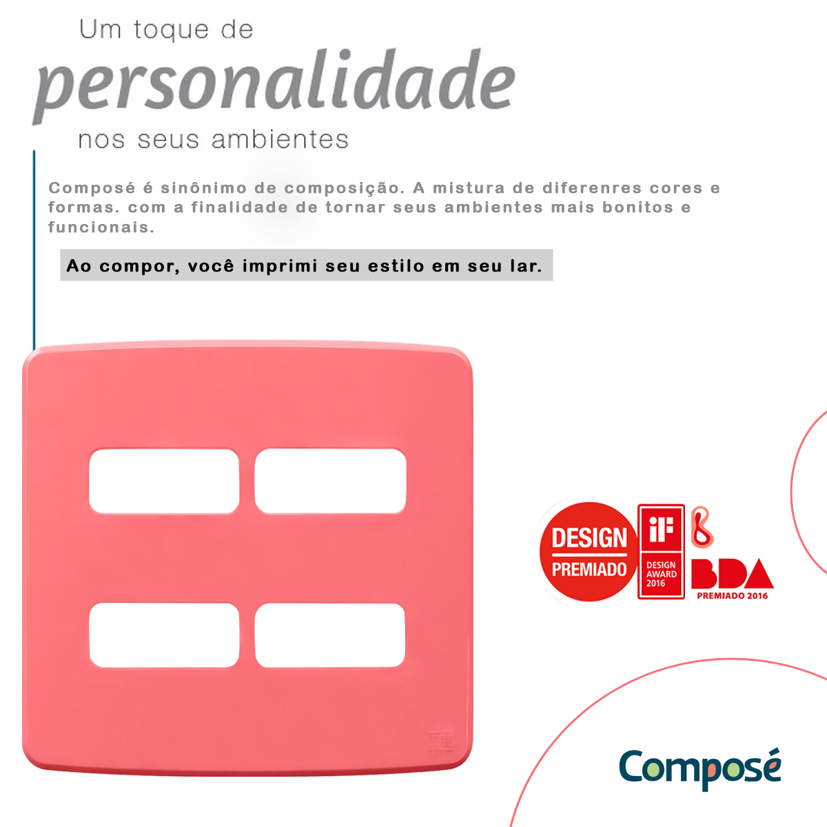 A definição de cores para a Linha de tomadas coloridas Composé foi feita a partir da teoria das cores e do círculo cromático. Ela oferece as cores quentes em tons vivos, as cores frias em tons pastéis e ainda as cores neutras, combinando com os mais diversos tipos de ambientes.
