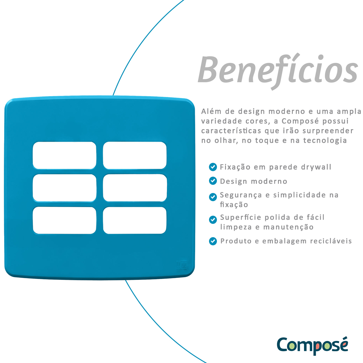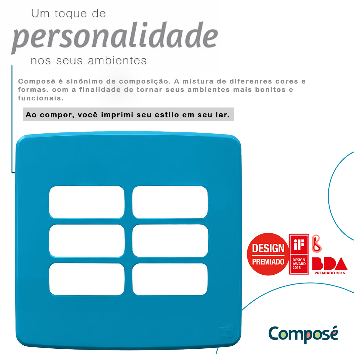 Além de design moderno e uma ampla variedade de cores, a linha de Tomadas & Interruptores Composé possui características que irão surpreender no olhar, no toque e na tecnologia.