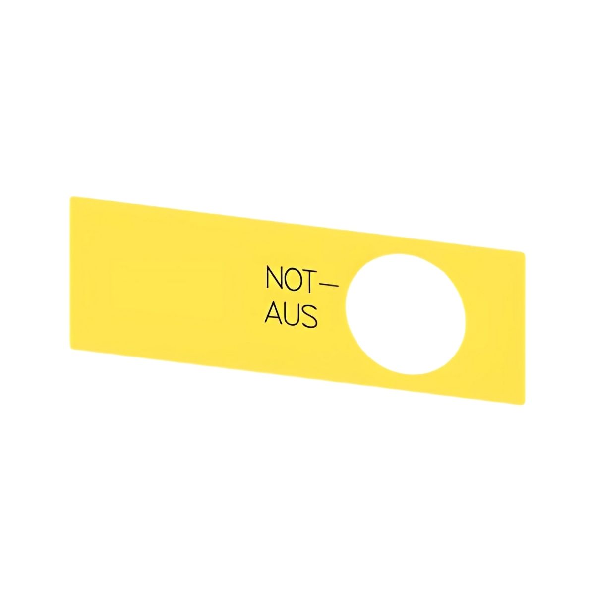 - Design e Inscrição: A placa tem a inscrição "NOT-AUS" em amarelo sobre fundo preto, garantindo alta visibilidade e compreensão imediata.