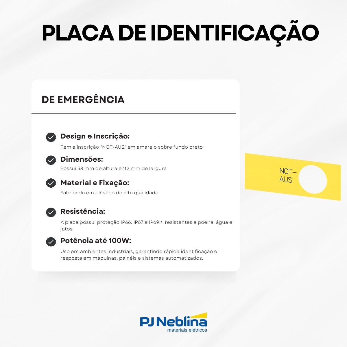 - Dimensões: A placa possui 38 mm de altura e 112 mm de largura, adequando-se a diversos modelos de botões de emergência.