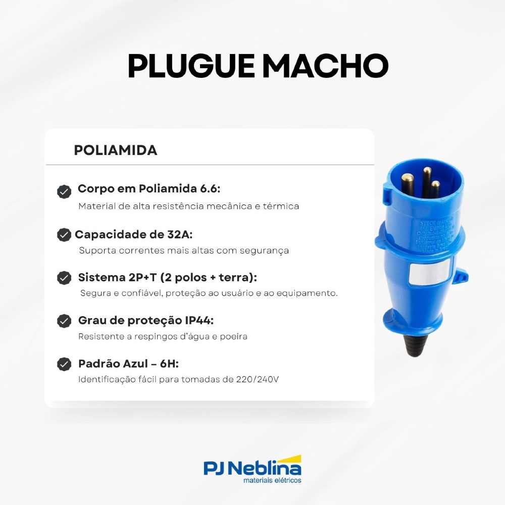 • Padrão Azul – 6H: identificação fácil para tomadas de 220/240V, garantindo compatibilidade e segurança.