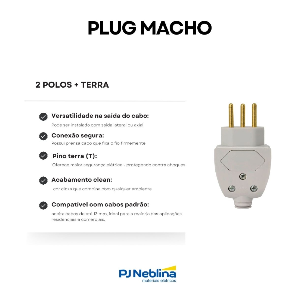 Plug Macho 2P+T 10A 250V Cinza Lateral Com Prensa Cabo Pial