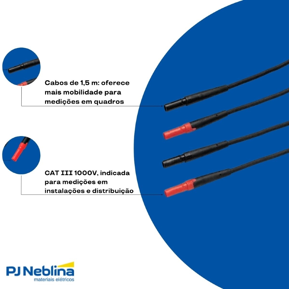 Os cabos de teste modulares proporcionam a conveniência de clipes, ganchos e suportes de fixação conforme necessário. Todos os cabos proporcionam proteção contra puxões e incluem terminações de entrada tipo banana que permite uma grande variedade de configurações de cabos de teste.