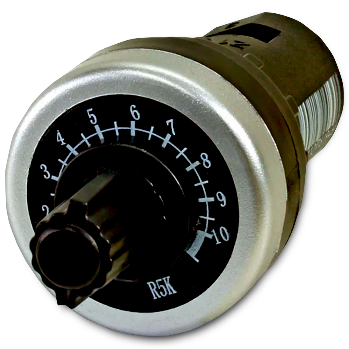 Potenciômetro ideal para uso em conjunto com inversores de frequência para o ajuste externo da velocidade.