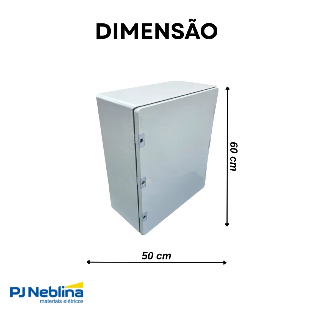 - Dimensões: 600x500x250mm (Altura x Largura x Profundidade): Este é um tamanho grande para um quadro de comando em ABS. Oferece um volume interno significativo (75 litros) para acomodar uma quantidade substancial de componentes, fiação complexa e permitir uma boa dissipação