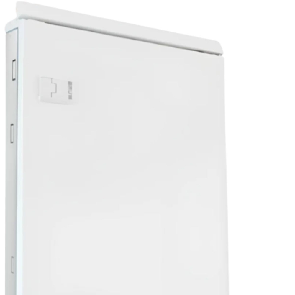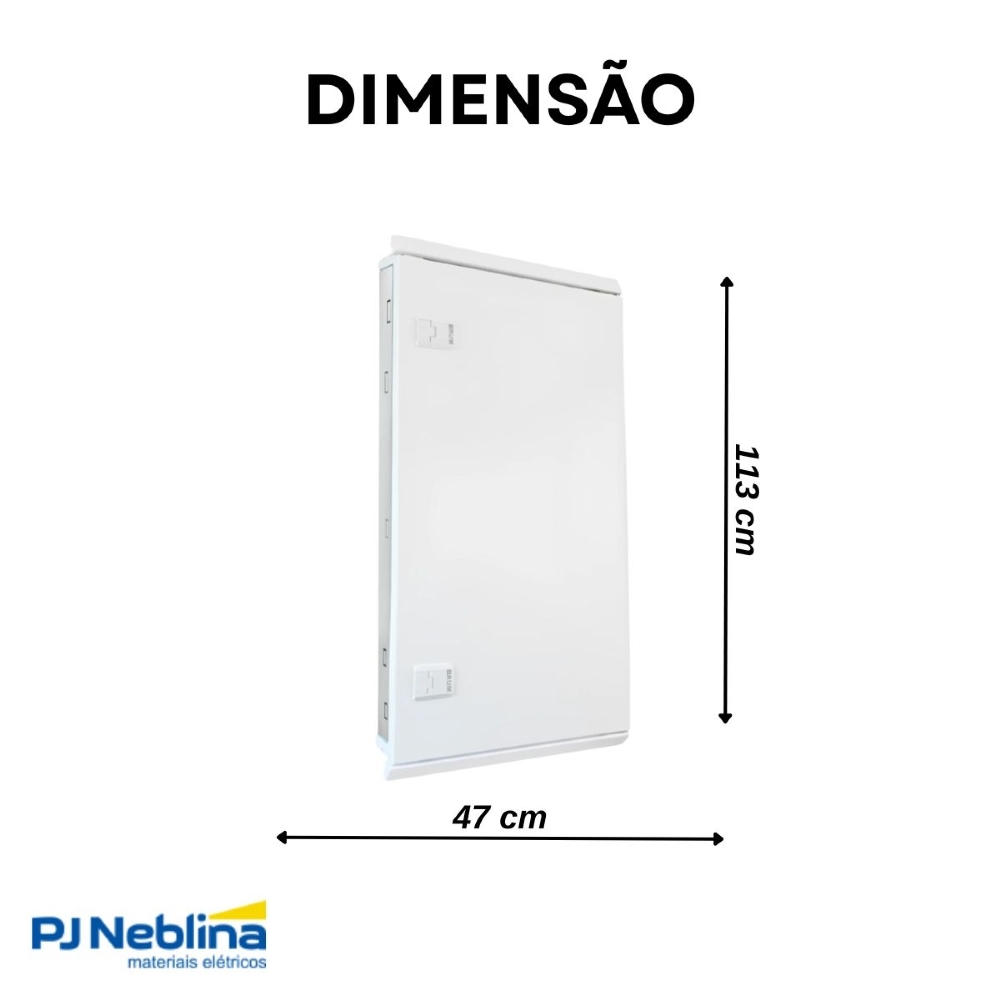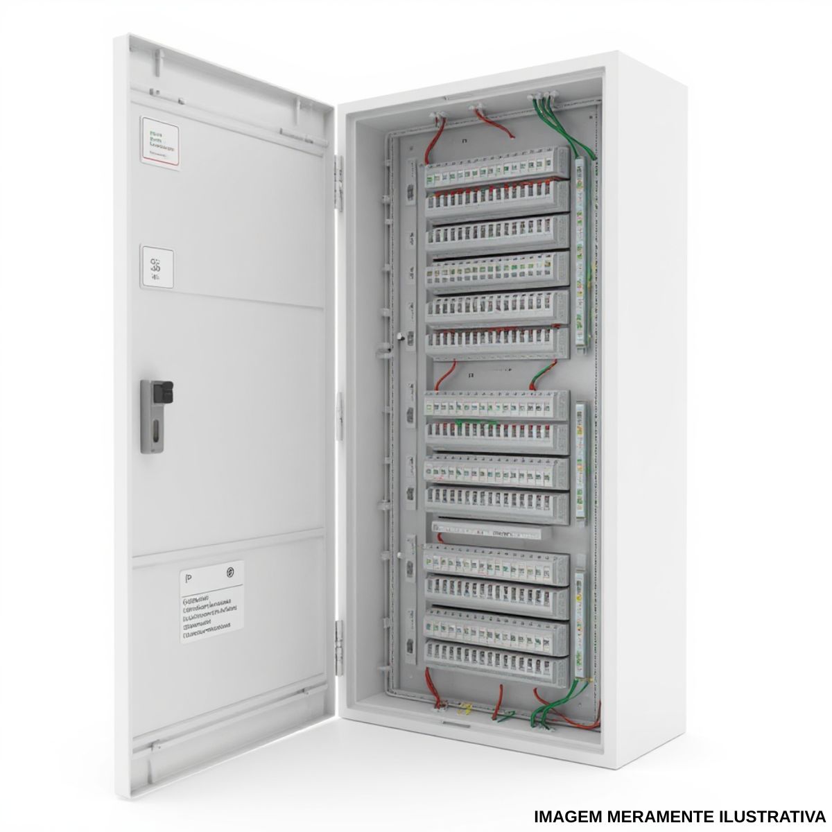 - Orientação: Vertical: Indica que o quadro é projetado para ser instalado com sua maior dimensão na vertical. Essa configuração otimiza o espaço na parede e facilita a organização interna dos diversos componentes e da fiação, o que é crucial em quadros com essa grande capacidade de módulos.