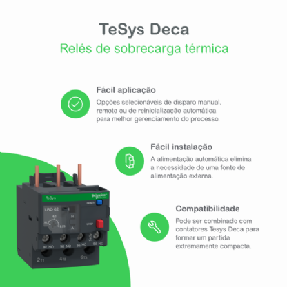 Os relés Tesys Deca foram projetados para as linhas de contatores Tesys Deca demonstrando uma proteção segura e eficaz. Este produto possui uma faixa de ajuste térmico de 12-18A/690V, classe de disparo 10A e está destinado para a proteção de motores trifásicos com menos de 7.5kW/400V.