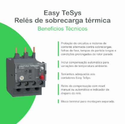 Pode ser montado diretamente em contatores EasyPact TVS com conexão de terminais de grampo de parafuso. Protege cargas desbalanceadas e motores de 2,2kW a 400VAC. Fornece reinicialização manual ou automática, contato auxiliar de trip e indicador de bandeira.