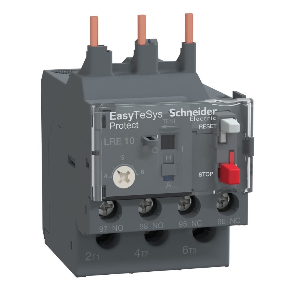 O relé LRE é um relé de sobrecarga térmica diferencial para uso com fusíveis ou disjuntores magnéticos GV2 L e GV3 L. Sua faixa de ajuste térmico é 4-6A 50/60Hz e a classe de disparo é 10A em conformidade com IEC 60947-4-1.