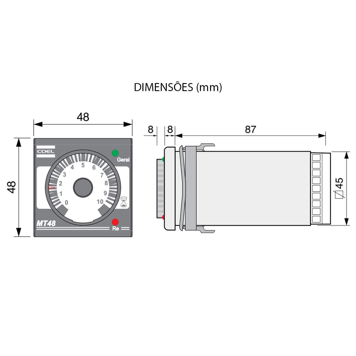 O temporizador eletrônico MT48M é um instrumento multiescala, multifunção, versátil e de fácil utilização com 2 saídas relés SPDT. Possui micro chaves (DIP interno) para configurar a base de tempo (de 1 segundo a 10 horas) e a função de temporização (10 modos de funcionamento).