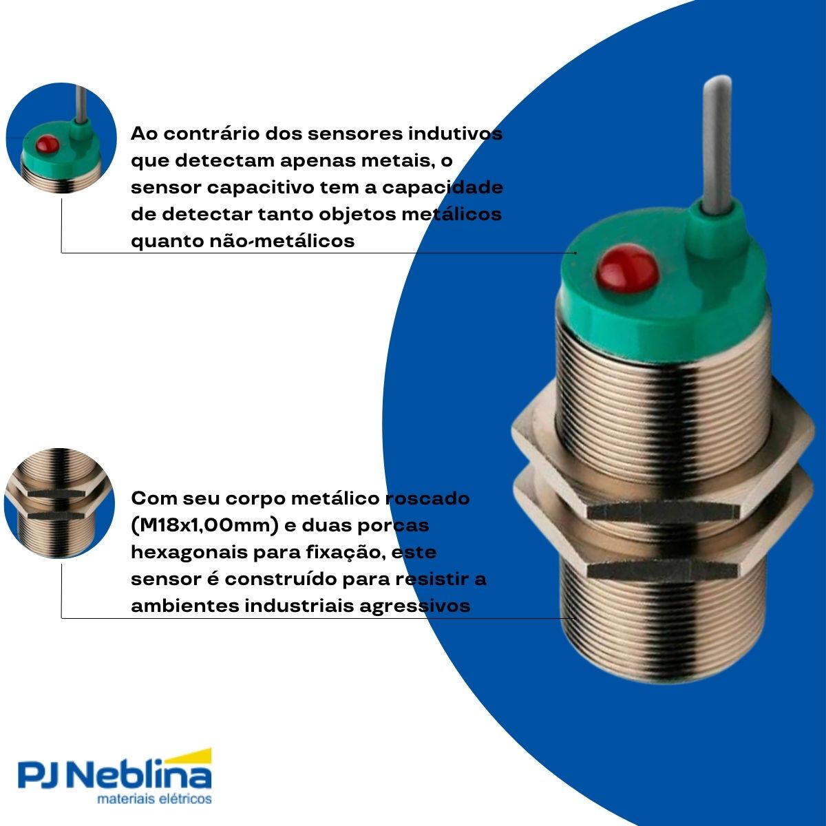 - Corpo cilíndrico roscado M18 metálico, resistente para ambientes industriais.