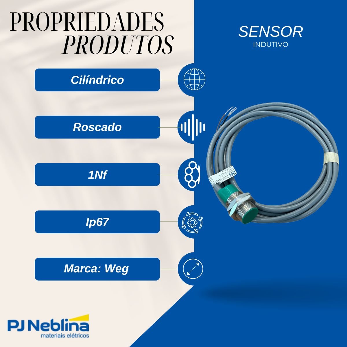 Sensor Indutivo Cilíndrico Roscado Sn=5Mm M18X1,00Mm Metálico 3 Fios 10-30Vcc Cabo 2M Pnp 1Nf 1 Led - Weg - Código Fabricante: SL5-18G1LPF-SC
