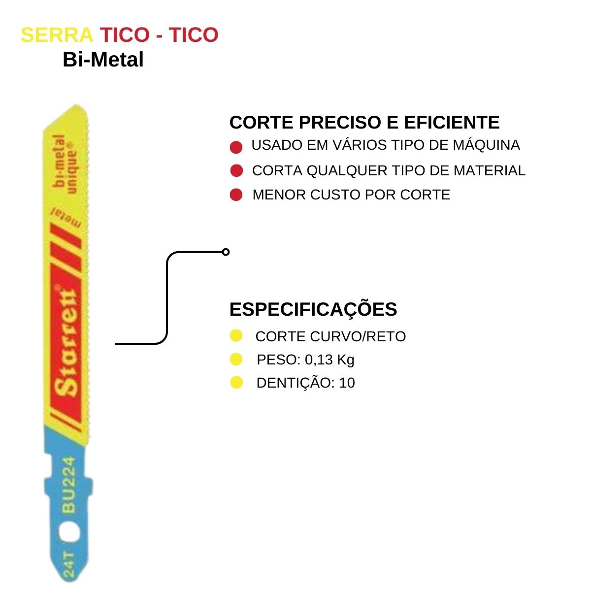 As lâminas de serra Tico-Tico com encaixe unificado Starrett são fabricadas com o novo AÇO BI-METAL UNIQUE™ e portanto incorporam a sua avançada performance de corte, ou seja, a nova “Starrett Bi-Metal Unique Saw Technology”.