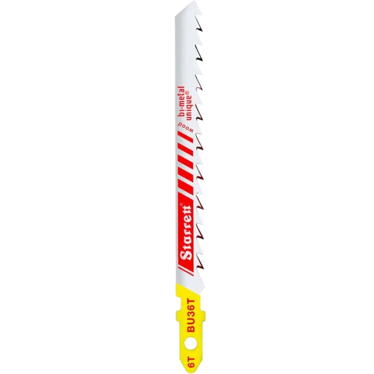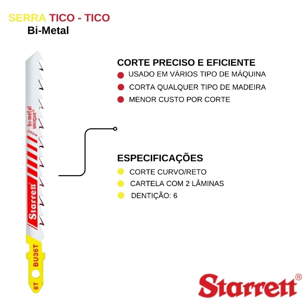 As lâminas de serra Tico-Tico com encaixe unificado Starrett são fabricadas com o novo AÇO BI-METAL UNIQUE™ e portanto incorporam a sua avançada performance de corte, ou seja, a nova “Starrett Bi-Metal Unique Saw Technology”.