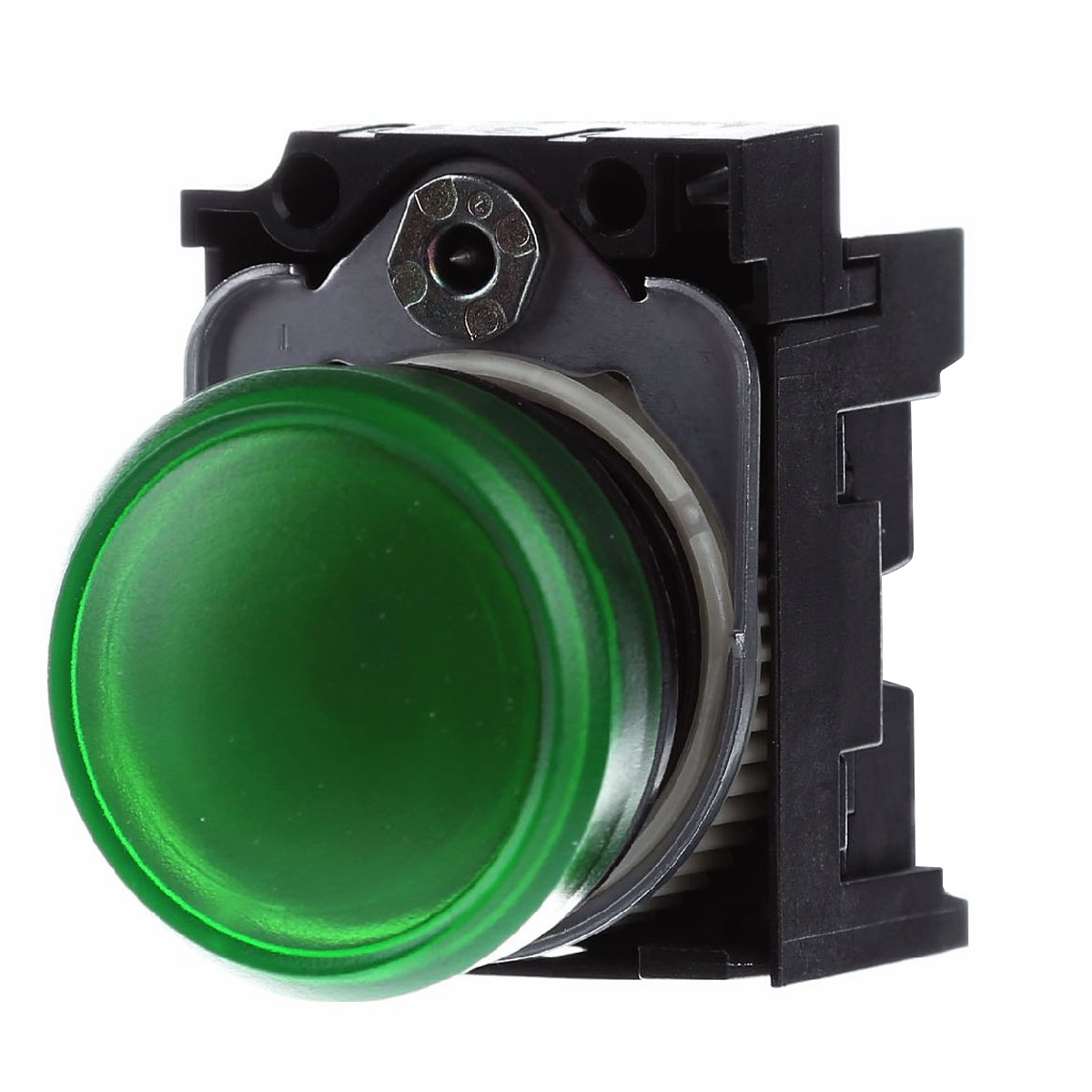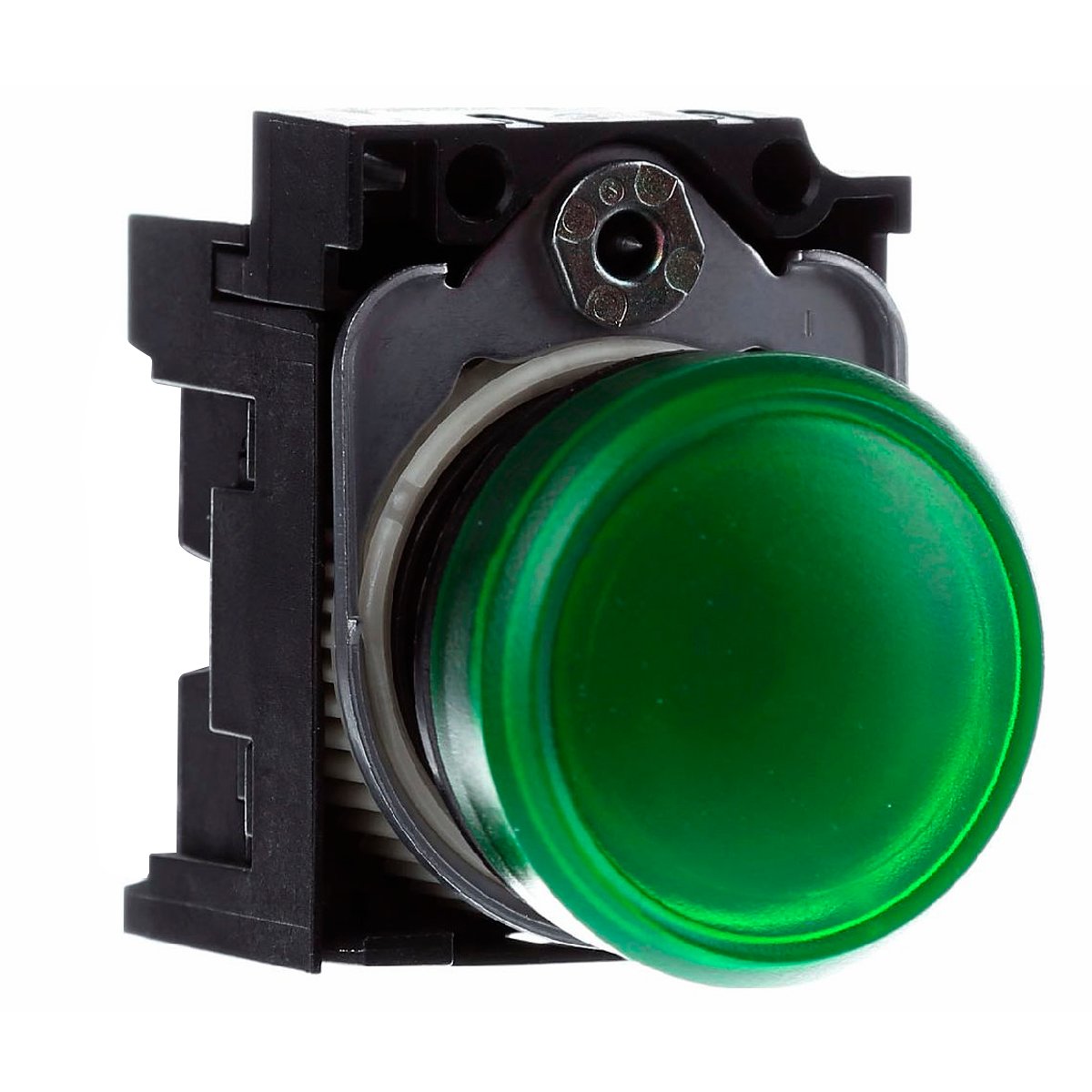 Indicador luminoso, 22 mm, redonda, plástico, verde, lente, plano, com suporte, módulo LED, com LED integrado 230 V CA, conexão parafusada.