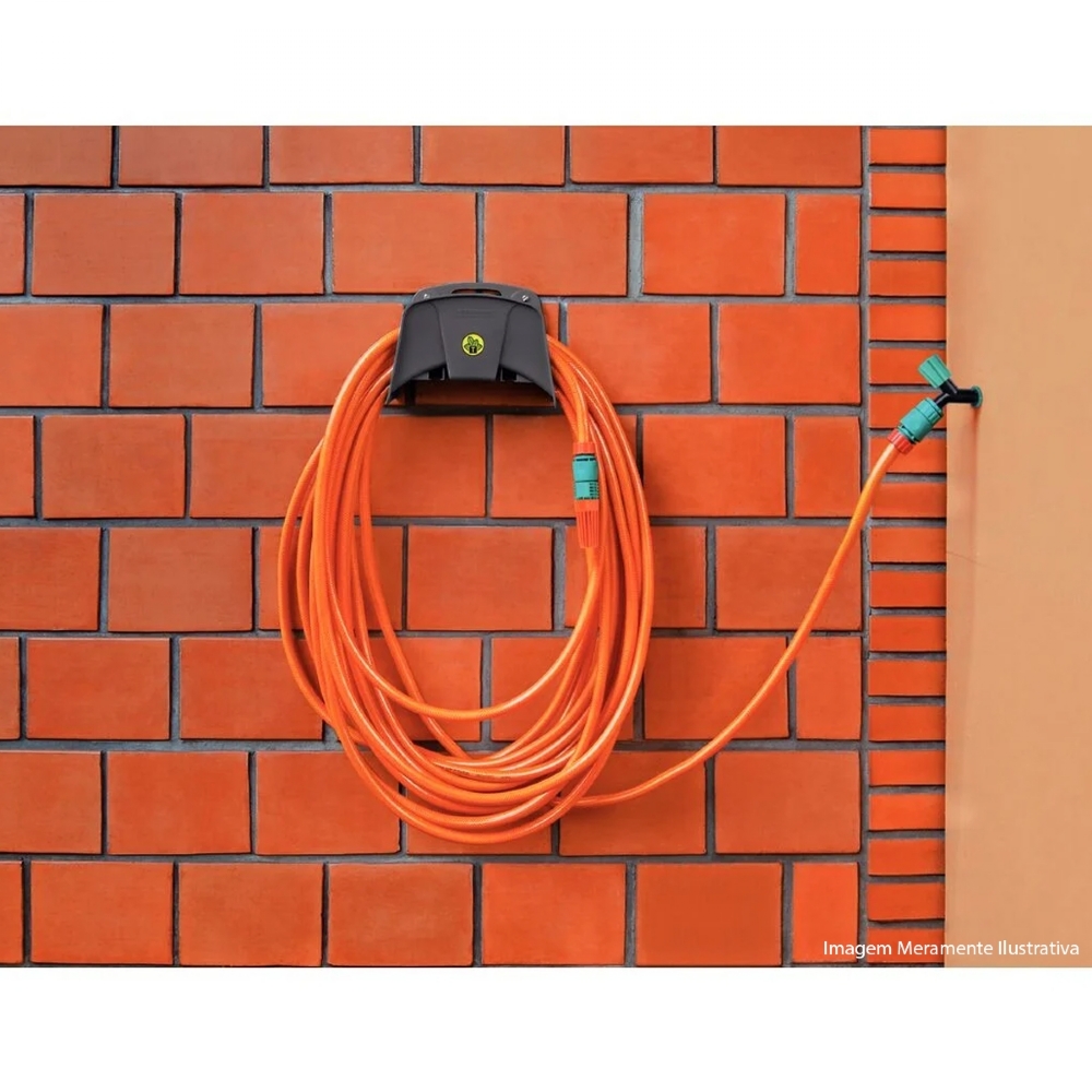 O suporte fixo permite o armazenamento de até 35 metros de mangueira de 1/2".