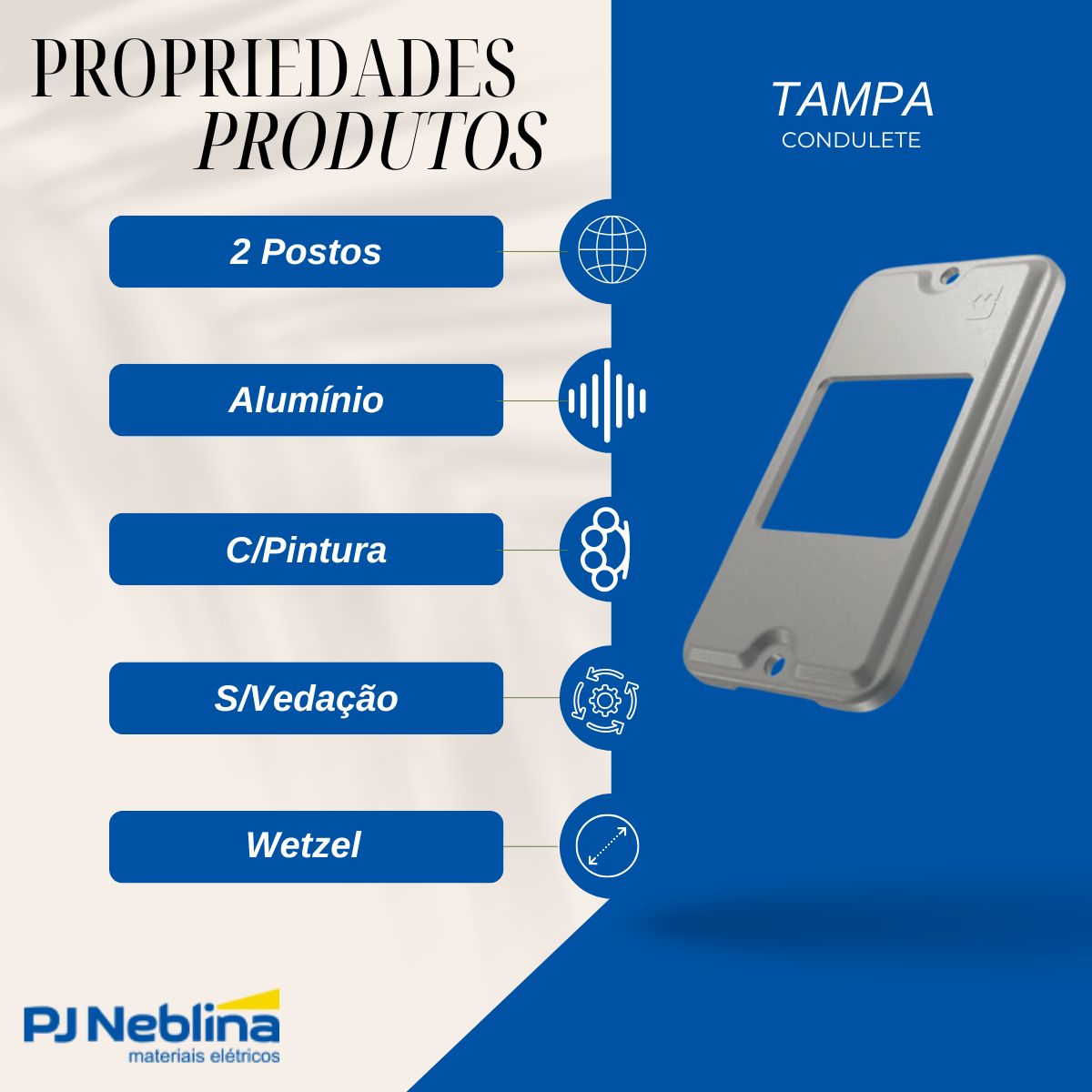 Tampa Condulete 2 Postos Juntos Alumínio 1/2-3/4 C/Pintura Cinza S/Vedação - Wetzel - Código Fabricante: TPCA-02 ALU CZ