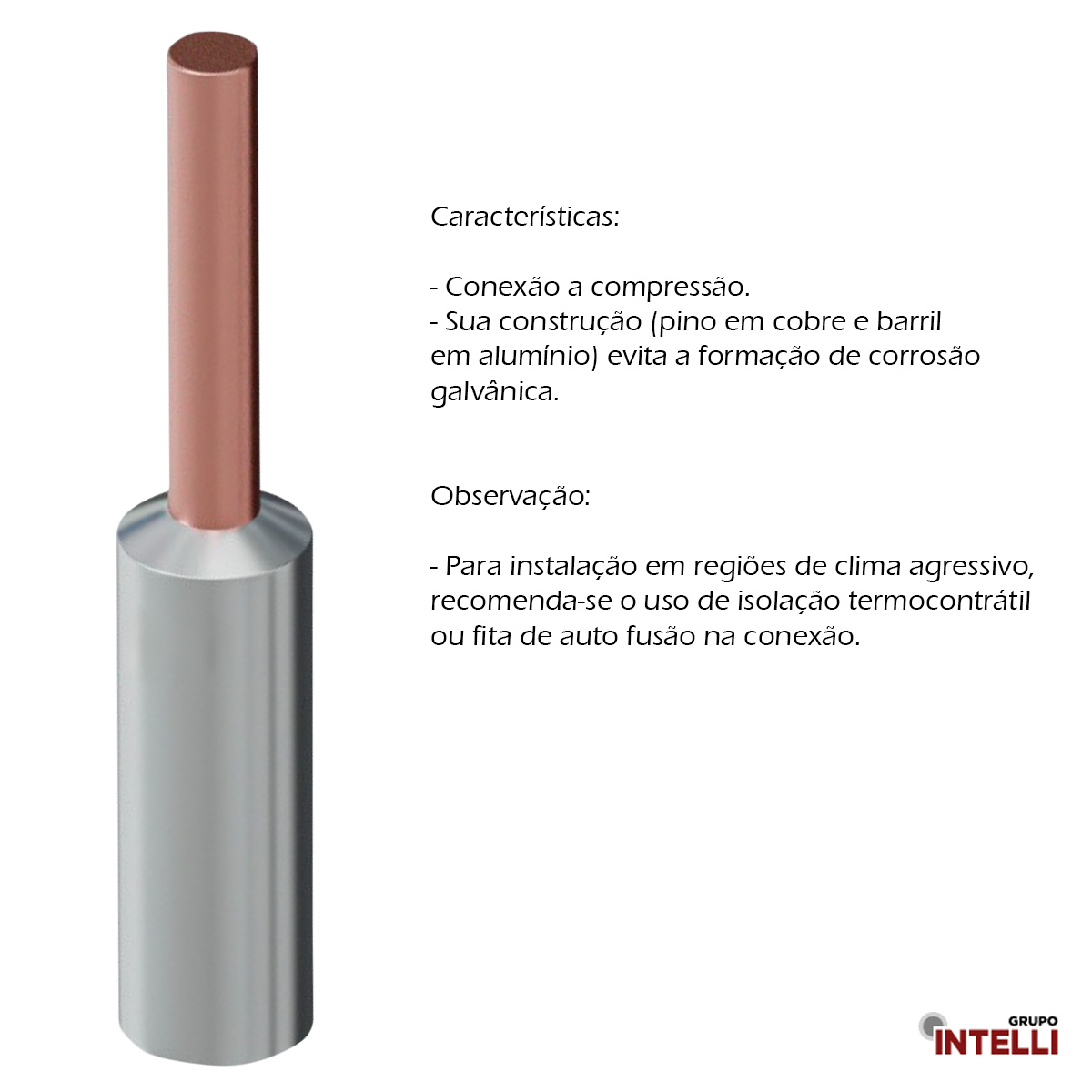 Características: Conexão a compressão. Sua construção (pino em cobre e barril em alumínio) evita a formação