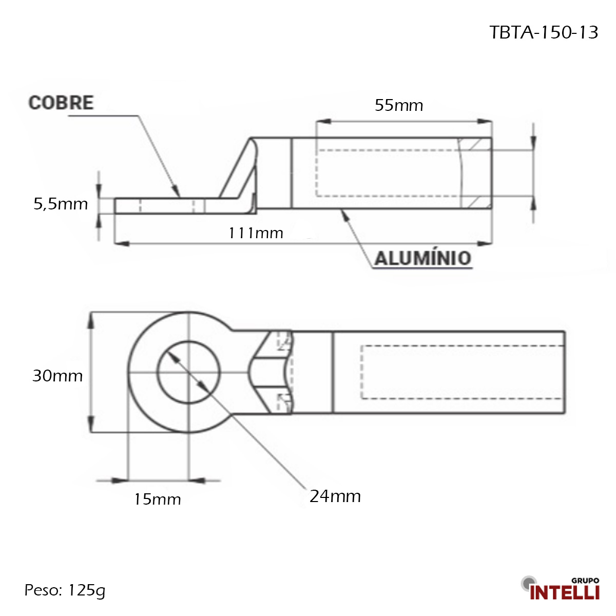 Terminal Compressão Cabo/Barramento 150Mm 1 Furo F=12,8Mm 107570 Intelli