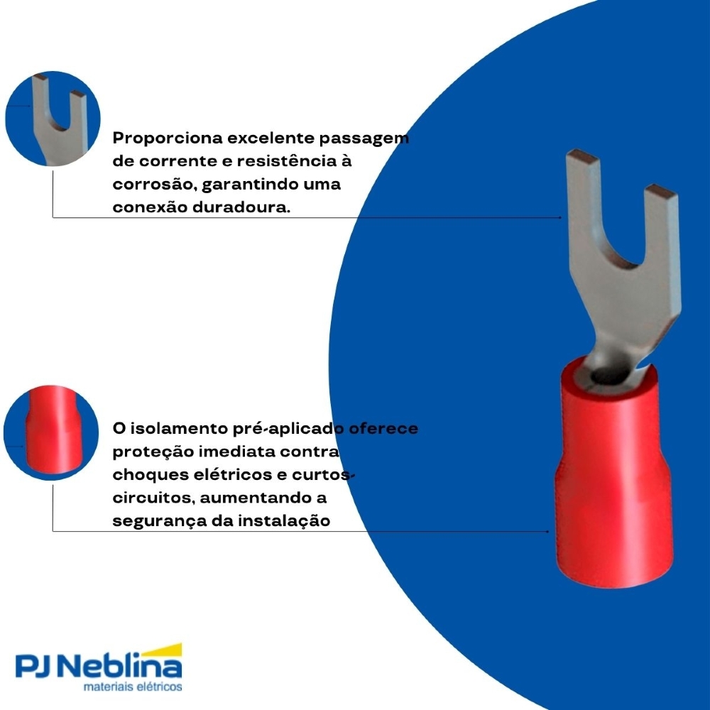 - Terminal tipo forquilha pré-isolado, ideal para condutores de 0,50 a 1,50 mm² (bitola 22-16 AWG).