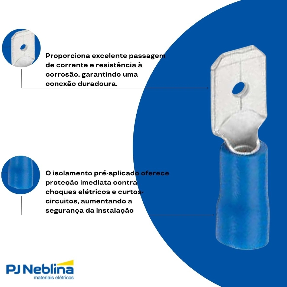 - Possui isolamento pré-aplicado na cor azul, facilitando a identificação e proporcionando proteção adicional contra curtos-circuitos.