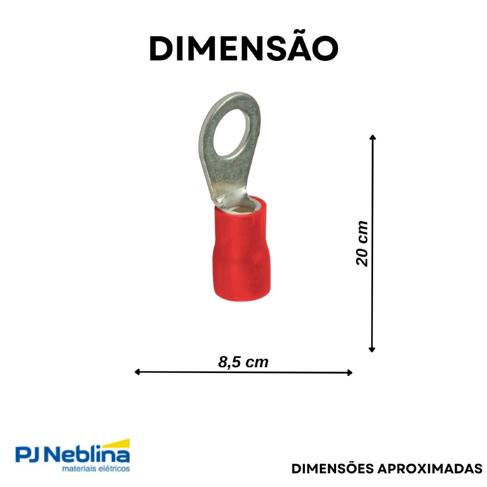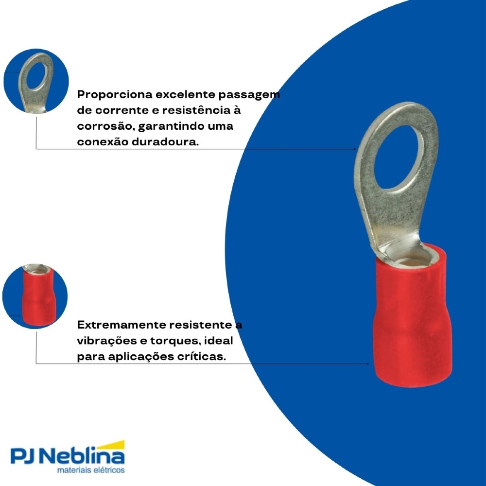 - Terminal elétrico tipo olhal (anel), projetado para conexões seguras e eficientes em sistemas elétricos.
