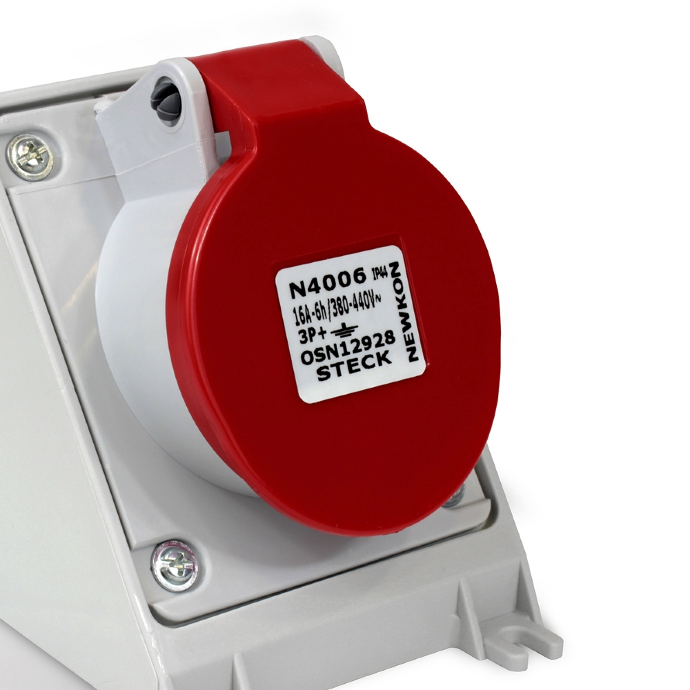 A tomada de sobrepor Newkon Steck N4006 em corrente nominal de 16A, tensão nominal (V) de 380/440 e 4 polos.Com grau de proteção IP44.. Os produtos da linha Newkon® são produtos em conformidade com as normas IEC 60309-1/2/4, 60259 & 60695-2-11 que permitem a alimentação de instalações ou equipamentos elétricos. Temperatura de trabalho contínuo: -25°C a 120°C e 30 minutos: até 200°C. Resistência ao fogo 650°C¹ & 850°C². Cor da carcaça: cinza claro. Composição: carcaça e tampas em poliamida 66, vedações em borracha natural NR. Contatos em ligas de cobre e parafusos em aço SAE 1018.